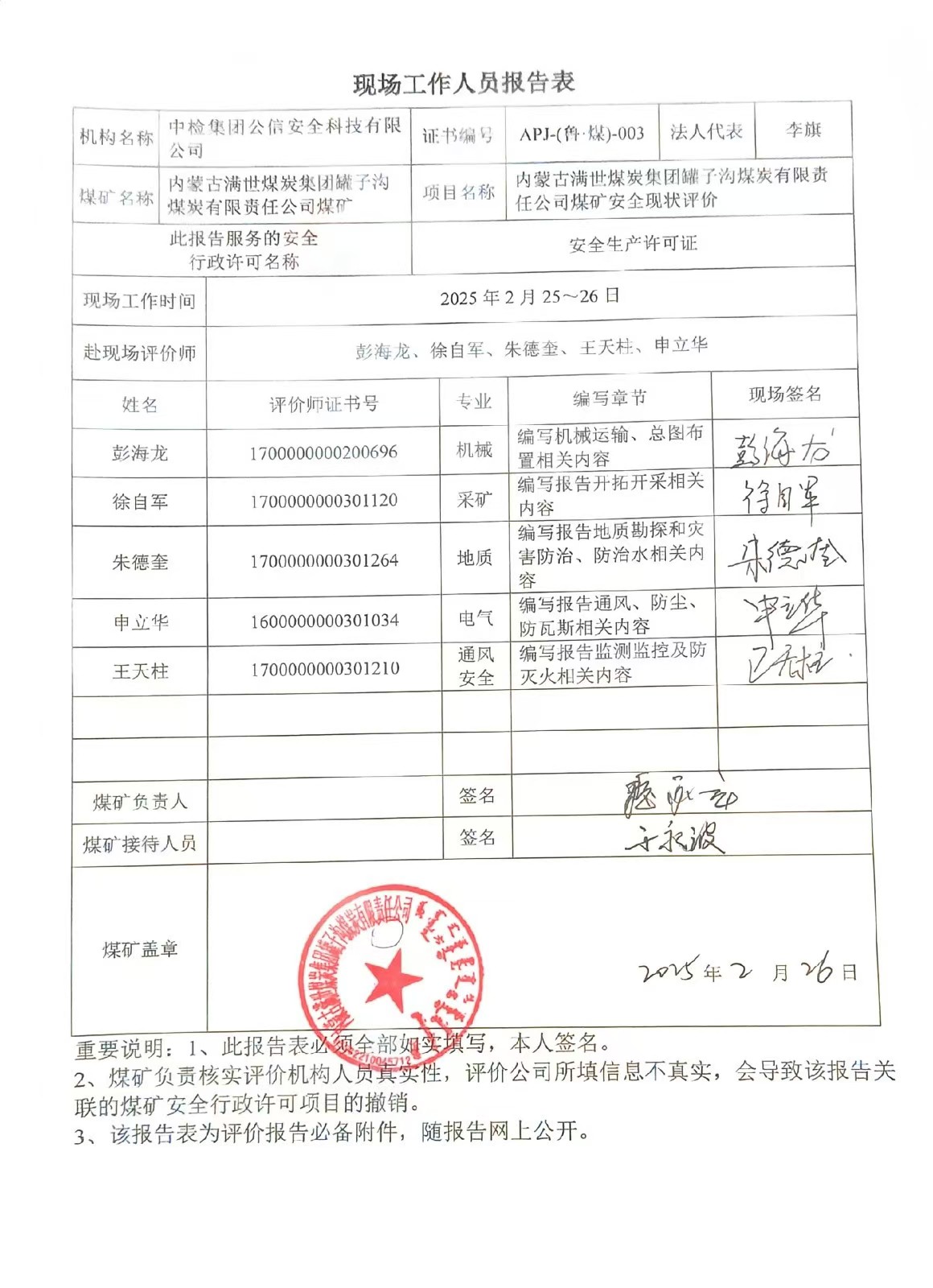 現(xiàn)場(chǎng)開展安全評(píng)價(jià)工作的人員、時(shí)間及主要任務(wù): 彭海龍 王天柱 申立華 朱德奎 徐自軍于2025年2月25~26日到現(xiàn)場(chǎng)進(jìn)行調(diào)查、搜集資料,進(jìn)行現(xiàn)場(chǎng)評(píng)價(jià)。 彭海龍 朱德奎、徐自軍于2025年5月19日對(duì)現(xiàn)場(chǎng)問題進(jìn)行復(fù)查,礦方均已整改合格。 彭海龍 王天柱 申立華 朱德奎 徐自軍 王兆亮 劉超對(duì)報(bào)告進(jìn)行了編寫。 | |||||||